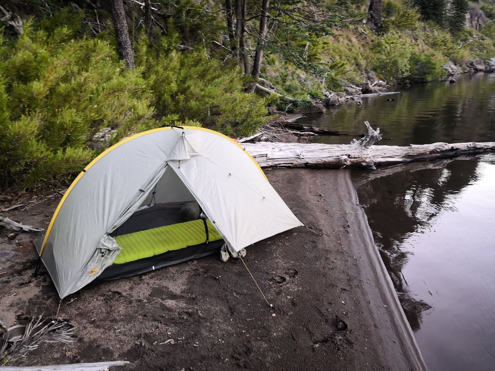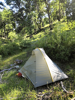 It soon became very clear that I would not be able to cross the plateau and descend the same day. Luckily Jan shows a detour to a water source on top of the plateau so I decided to camp there and call it a day. But when I arrived at the water source it turned out to be a stinking shallow cow pond. The idea of having to drink this disgusting water mobilized my last energy and I decided to walk a bit further to a real lake. It took my almost 45 minutes to hike this distance of less than 1 kilometer because it was a horrible bushwhack down a steep slope. I was getting nervous now because the light was fading. If I wasn’t able to camp at the lake shore I would not be able to get back in the dark …