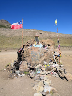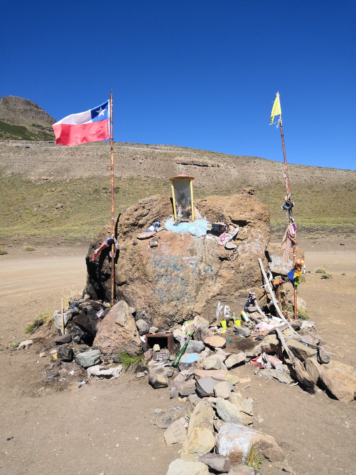 I continued on a dirt which looked like being on mars. Nothing but grey volcano ashes and no shelter whatsoever. I started to worry about camping here. I had enough water for the night but if a strong wind came up I would spent a very uncomfortable night in my tent. There were few cars on that road but strangely enough each driver would stop and offer me water. I asked one of them when this desert ends and vegetation starts again. When I was told that this scenery continues for 30 kilometers I realised that it was probably better to hitchhike a bit … A young Chilean couple picked me up immediately. Soon we passed several little stone memorials with a Chilean flag. I asked them what they meant and was told a very sad story. In May 2005 a company of conscripts were sent out from the barracks where I had just had my lunch break on a training march – despite a very bad weather forecast. Five hours into their march the ill equipped mostly teenage soldier where hit by severe snow storm. The lost orientation in a white out – and 47 soldiers died along the road. Each stone monument marked one of the places were a corpse had been found later. This so called tragedy of Antuco was the biggest modern military desaster in Chilean history. Although now in summer I would not have encountered a snow storm I was all of a sudden very happy to be in a car ….